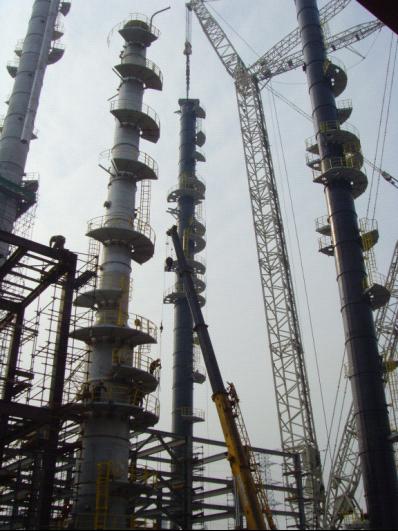 這次惠生大型設備的吊裝創造了目前公司吊裝史上的五個之最,即成功吊裝最高的塔(硫化氫濃縮塔高81.2m),成功吊裝最重的塔(甲醇洗滌塔重350t),使用的吊車規格最大(1250t吊車),最先采用鋼結構模塊安裝,最大規模的一次大型設備吊裝。