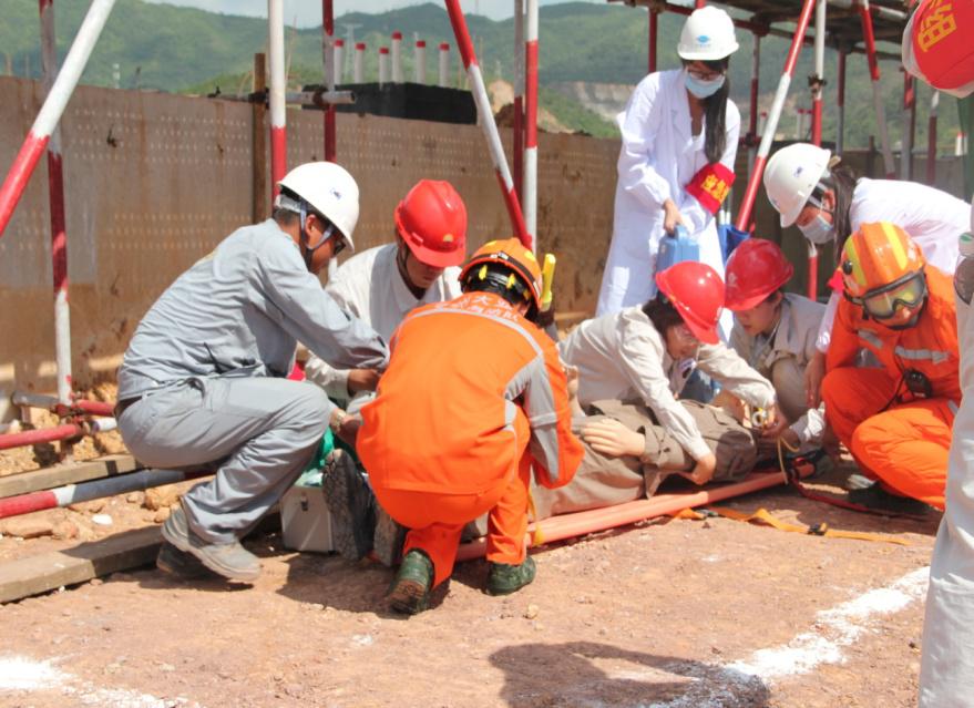 演練場景為硫磺庫棚東側腳手架有一人在約4米高處觸電后從高處墜落。發現事故后,項目部安全監護人員及時上報,現場專職安全員劉占洋撥打救援電話,并上報應急總指揮。總指揮齊少華啟動項目部“1號應急預案”。應急救援組李小蘭、王亞萌等進行傷者救護,安全保障組張小民組織緊急集合,后勤保障組彭井恩帶隊進行警戒圍護,季信軍、高鐵騎救護車輛指引。應急小組分工明確,各司其職,救援、警戒、緊急集合同時進行,傷者救護在10分鐘內將傷者送往醫院救治。