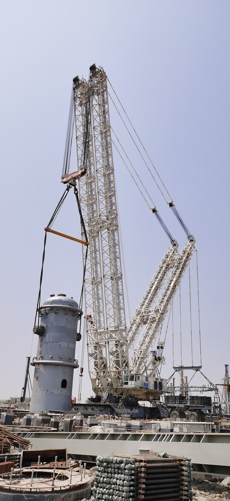 該EO反應(yīng)器為乙二醇裝置單體最重設(shè)備,設(shè)備凈重1128噸。江蘇分公司浙石化二期乙二醇裝置項(xiàng)目部施工人員采用由3200噸履帶吊主吊、280噸履帶吊溜尾進(jìn)行吊裝。經(jīng)過約2個(gè)多小時(shí)的起吊、平衡、轉(zhuǎn)體,上午11點(diǎn)16分順利就位,設(shè)備一次吊裝成功。