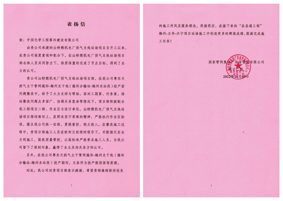 10月9日,東北公司收到國家管網集團廣東省管網有限公司項目二部發來表揚信,對東北公司承建的汕特燃機電廠供氣支線站場項目保質保量完成節點目標以及為粵東天然氣主干管網揭陽—梅州支干線(揭陽分輸站—梅州末站段)投產過程中做出的貢獻,給予表揚和感謝。