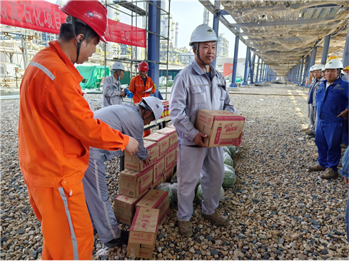 近日,湛江一體化項目部開展“情系一線送清涼、安全生產保安康”慰問活動,為一線勞動者送上了酸梅湯、藿香正氣水等防暑降溫物品,向他們的辛勤付出表示感謝,并叮囑大家要勞逸結合,在作業過程中采取有效的防暑降溫措施,確保暑期各項作業安全有序高質量進行。