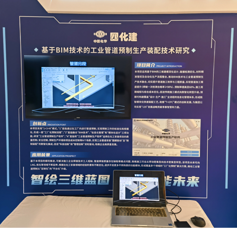 會議期間,舉行了中國化學首屆青年創新創效展,公司青年創新創效項目——基于BIM技術的工業管道預制生產裝配技術研究項目亮相展會,通過視頻、圖文及展板講解等多種形式,全方位展示了項目成果。該項目通過“1+3+N”模式推動施工數字化轉型,預制率提升至60%,為傳統施工模式注入數智化動力。